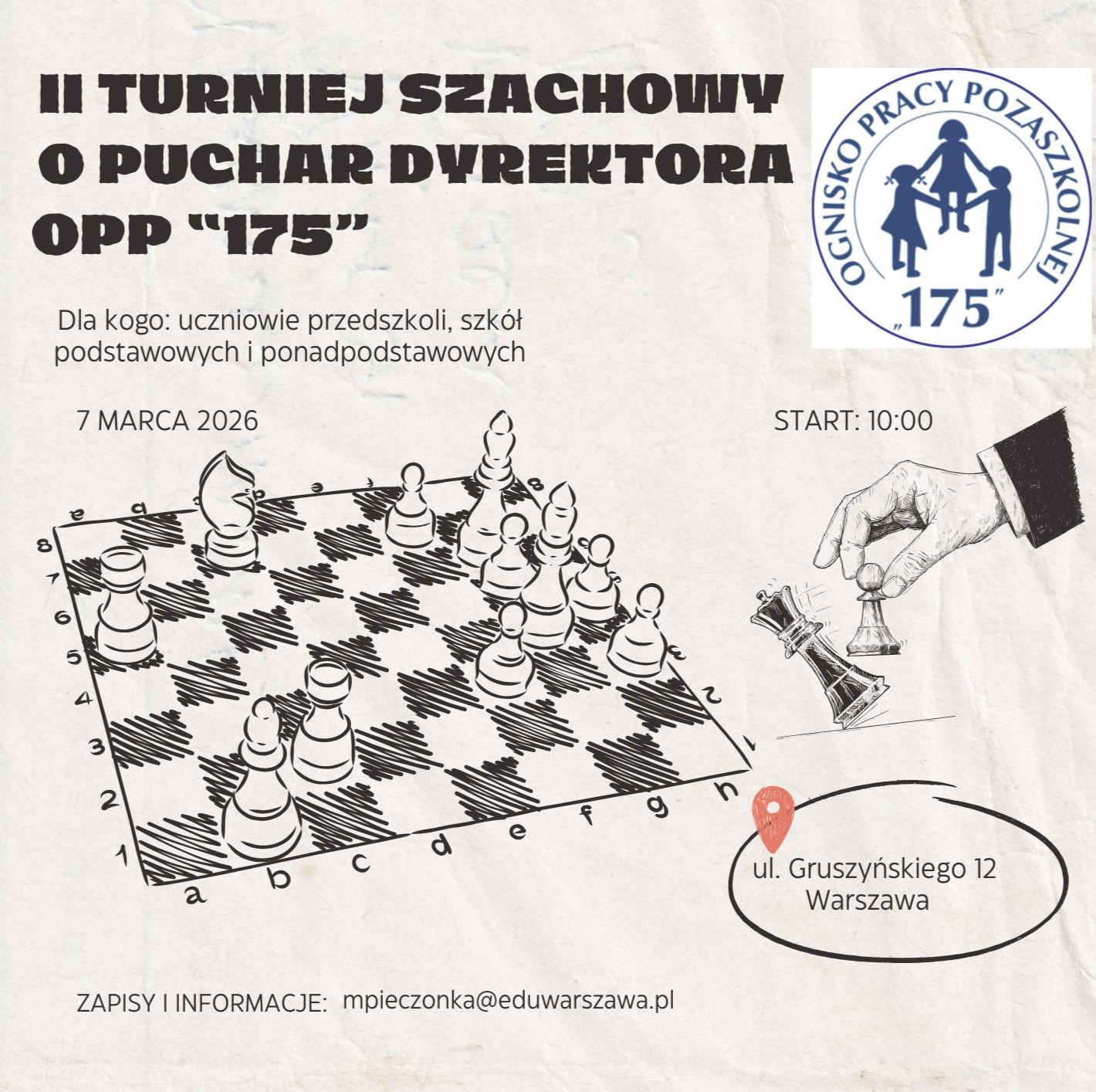Uwaga! Ogłaszamy II Turniej Szachowy o Puchar Dyrektora OPP „175”. Prosimy o zapoznanie się z Regulaminem zamieszczonym poniżej plakatu a także z krótką historią konkursu zmieszczoną na końcu zakładki.